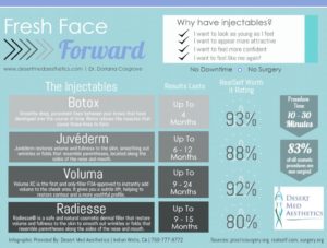 This infographic shows the differences between various injectables including Botox®, Juvéderm®, Voluma, and Radiesse®. Find out what each injectable is used for, how long the results last, and how it was rated on RealSelf.